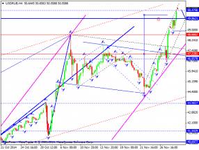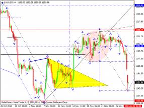 Если брать лонг, то делать это нужно прямо сейчас, так как отскок от 1.5592 может вернуть в рынок очень сильных покупателей, которые будут стремиться к концу года закинуть фунт на его прежние позиции в районе 1.5900. Стоп приказы по таким сделкам необходимо расставлять ниже на 7-10 пунктов поддержки 1.5592. Основной целью лонга будет возврат и закрепление выше верхней границы быстрого нисходящего канала фиолетового цвета R2, а также тестирование сильного сопротивления 1.5711, которое не сумело на прошлой неделе оказать существенной поддержки паре. Возврат GBPUSD к 1.5798 будет первостепенной недельной задачей для лонгов, откуда в рынок могут заходить крупные покупатели в расчете на более глубокую коррекцию.