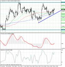 Осциллятор стохастик 'неуверенно' вышел из зоны перепроданности и в данный момент не формирует четких сигналов, поскольку линия %К практически пересеклась с линией %D.