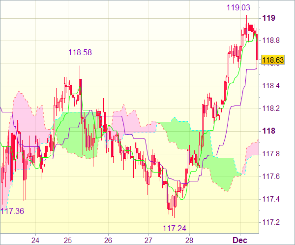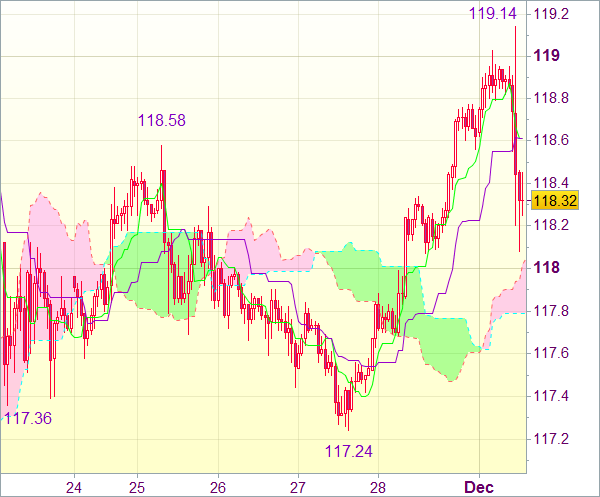 Откат доллара после внутридневного непродолжительного роста до 119,14 указывает на формирование внутридневного максимума на данной отметке. Далее возможна консолидация. Тем не менее верхнее Кумо на (118,02), скорее всего, ограничит движение вниз. Затем возможен очередной виток роста. Пробой зоны 118,60-65 может сдвинуть пару к 118,95-00. Однако лишь прорыв вышеупомянутого сопротивления (119,14) станет признаком возобновления восходящей волны и, вероятно, подлит рост до 119,50-55.