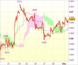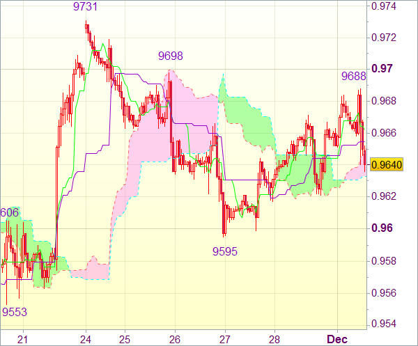 Ввиду приведенного анализа предпочтительнее держать длинные позиции от 0,9635. Пробой поддержки 0,9621 может привести к тестированию поддержки 0,9595 (минимум прошлой недели). Однако лишь в случае пробоя описанный сценарий аннулируется и можно рассчитывать на падение до 0,9565-70. Тем не менее поддержка 0,9553 должна остановить движение вниз. Котировки, скорее всего, останутся выше предыдущей поддержки 0,9531.