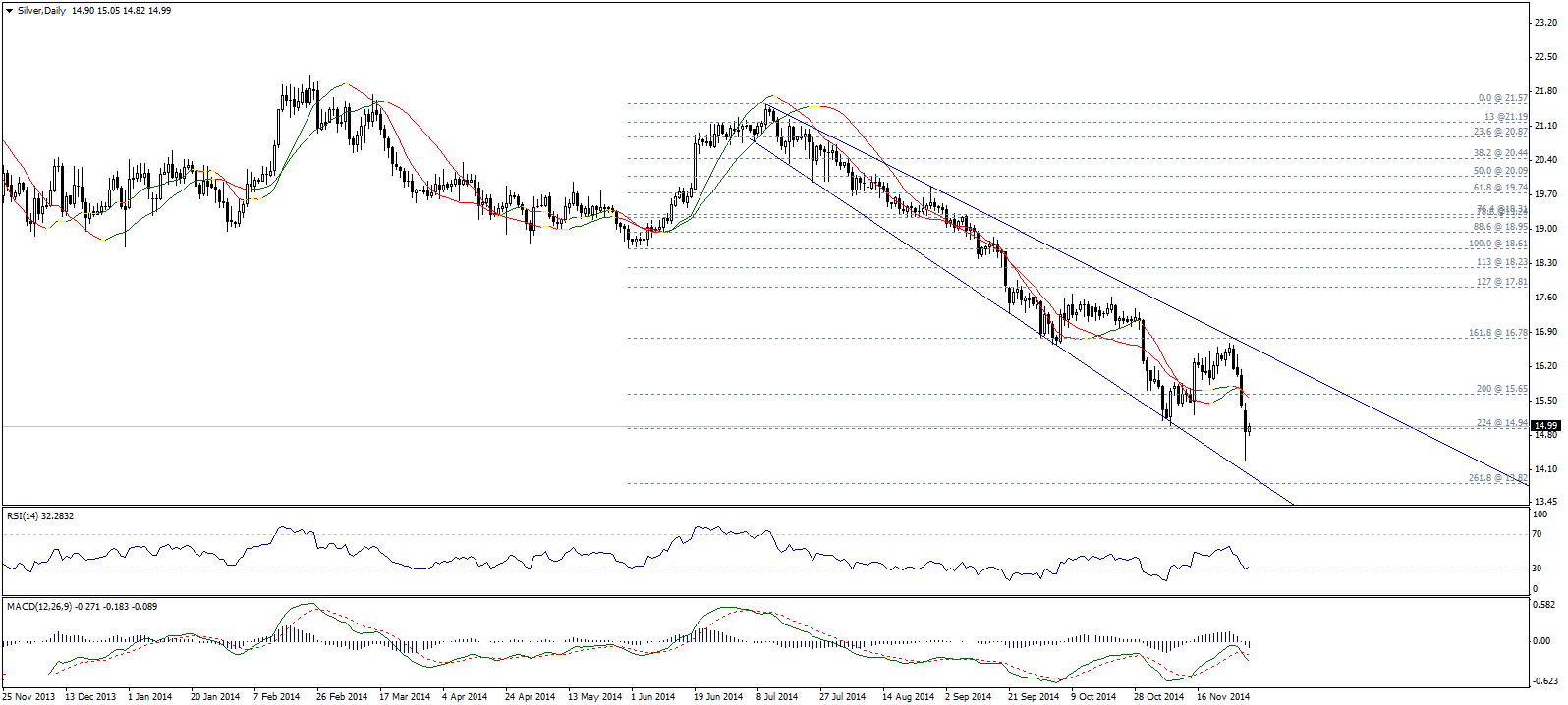 Золото открыло неделю ниже линий Линейной регрессии 34 и 55, что наряду с формированием MACD отрицательного кроссовера указывает на возможность дальнейшего снижения. Тем не менее, для подтверждения медвежьего сценария нам необходим прорыв уровня 1136,25, в данном случае нашей целью будет являться область поддержки 111,25.
