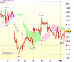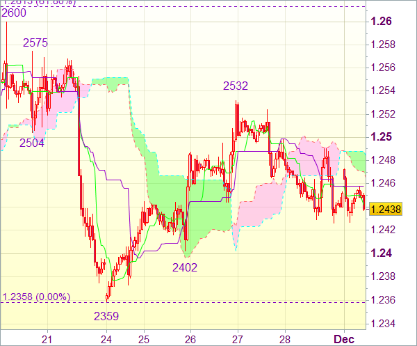 После недолгого роста до отметки 1,2490 (чуть ниже верхнего Кумо) евро продолжил испытывать давление. Это говорит о том, что вести длинные позиции от 1,2445 следует с особой осторожностью. Уровень 1,2425 должен устоять, чтобы можно было рассчитывать на очередной виток роста. Пробой зоны 1,2490-00 укажет на окончание отката от 1,2532. Затем пара может снова направиться к данному сопротивлению, и далее к 1,2550-55. Однако с учетом предстоящей консолидации движение вверх, скорее всего, ограничится сопротивлением 1,2575. Котировки, вероятно, останутся ниже сопротивления 1,2600.