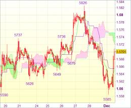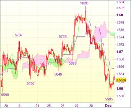 На фоне возобновления интереса к покупкам пары чуть выше 1,5600 фунт стерлингов продемонстрировал более сильный, чем ожидалось, скачок вверх. Это аннулирует наш негативный прогноз. Далее не исключено движение к сопротивлению 1,5625 (также нижнее Кумо). Однако лишь пробой данной отметки укажет на образование минимума и, возможно, вызовет более сильный рост до 1,5753 (верхнее Кумо), а затем до 1,5775-80.