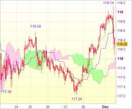 Поэтому рекомендуется покупать доллар на откатах, но на более высоком уровне. Зона 118,00-10 должна остановить падение. Пробой нижнего Кумо (117,79) укажет на образование максимума. Затем возможно движение к 117,50. Тем не менее поддержка 117,24 (минимум прошлой недели), скорее всего, остановит падение.