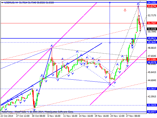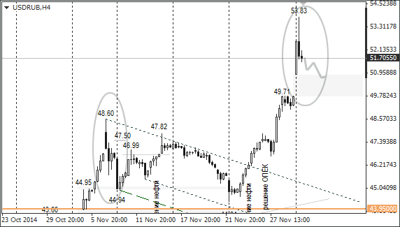 Российский рубль после ещё одного выброса цены вверх развивает импульс на снижение. На сегодня рассматриваем отработку уровня 49.55. Далее - рост к уровню 51.75. Таким образом сложится новый диапазон консолидации. С пробоем вверх рассмотрим возможность ещё одного обновления максимума, вниз - продолжения снижения к уровню 47.00.