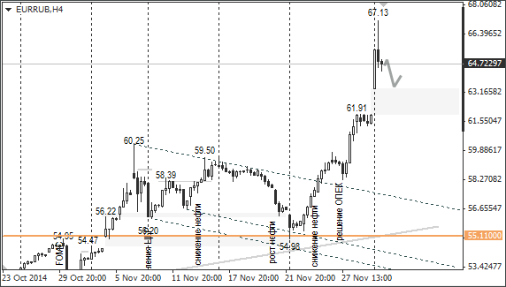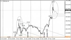С открытия торговой сессии на внутреннем валютном рынке рубль обвалился до 53,80 за доллар и 67,13 за евро. Доллар США и евро отыгрывали утреннее падение нефтяных цен. Котировки снижались до отметки 67,52 долларов за баррель. Рубль далеко отплыл от берега без поддержки ЦБР – пора начинать коррекционное движение и возвращаться к 48,60 за доллар, и 60 за евро.