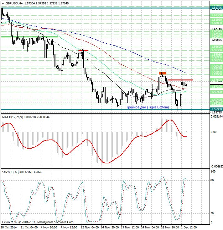 Курс валюты зажат между скользящей средней с периодом 144 (уровень сопротивления 1.5800) с одной стороны и средних с периодами 34, 89 и 55 (уровни поддержки 1.5710/075 и 1.5695) с другой.