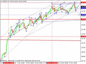 Курс валюты по-прежнему расположен значительно выше скользящих средних с периодами 34, 55, 89 и 144, которые направлены вверх и указывают на сохраняющиеся бычьи настроения (в среднесрочной перспективе), а также являются рядом уровней поддержки 118.075/05, 117.30 и 115.70.
