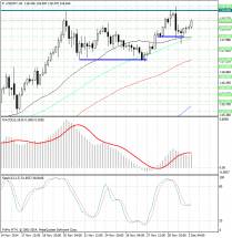 Гистограмма MACD расположена в положительной зоне, в ближайшее время может пересечь свою сигнальную линию снизу вверх и тем самым сформировать сигнал на покупку USD/JPY.