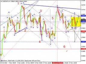 Валютная пара доллар франк отработала структуру снижения к нижней границе консолидации. На сегодня рассматриваем развитие структуры роста к уровню 0.9675. Таким образом получим консолидационный "Вымпел". Далее будем рассматривать возможность выхода из него вниз на отработку уровня 0.9500.