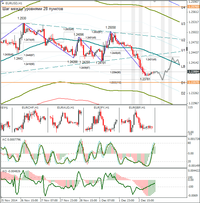 Позже в Китае вышел индекс деловой активности HSBC в сфере услуг, который в ноябре вырос до 53 с 52,9 месяцем ранее. Азиатские участники рынка проигнорировали данный отчёт. В момент написания обзора евро/доллар торгуется в узком диапазоне на уровне 1,2385. Допускаю, что евро/доллар снизится до 1,2365, после чего курс восстановится до 1,2430.