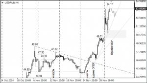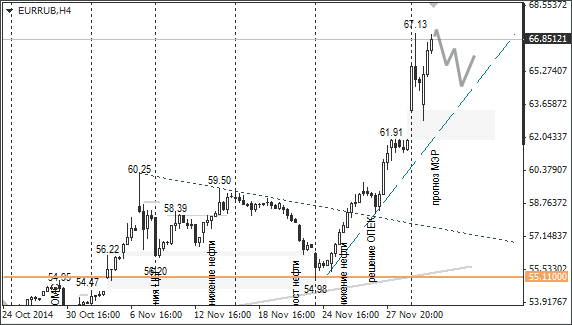 Уже точно можно сказать, что сегодня ЦБ РФ повысит официальные курсы доллара и евро на завтра (4 декабря). Шок от падения цен на нефть и прогнозов МЭР прошёл, поэтому с открытия рынка ожидается рост рубля. Возможно, рынок откроется на вчерашних уровнях закрытия. По нашим оценкам, коррекция достигнет 52,75 и 63,86 соответственно. Если появятся ещё негативные сюрпризы для российской экономики и рубля, то он продолжит падать, обновляя исторические минимумы.