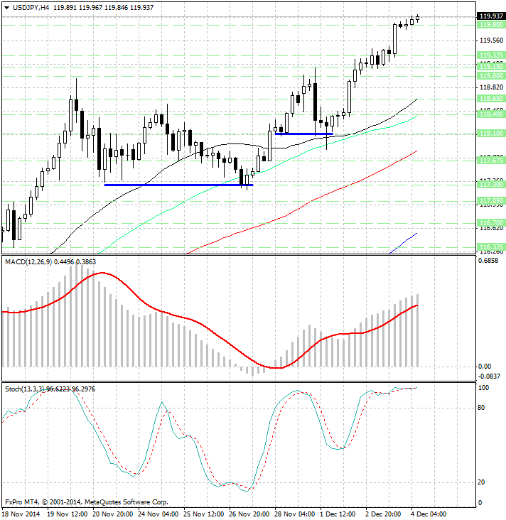 Обратив внимание на 4х часовой график можно заметить, что пробой уровня сопротивления 119.325 привел к существенному усилению бычьих настроений и наша первая цель 119.90 была достигнута сегодня на торгах в Азии...