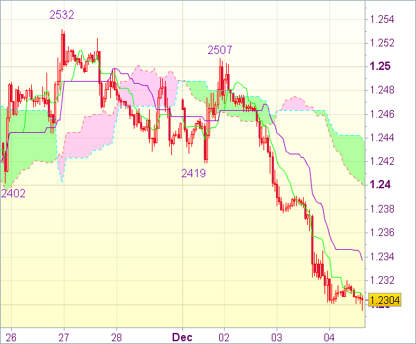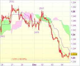 Ввиду приведенного анализа рекомендуется открывать короткие позиции по евро на росте до 1,2390-95, однако воздержаться от входа в рынок на данной волне вниз. Лишь прорыв отметки 1,2419 (предыдущая поддержка) укажет на образование минимума. Пара, вероятно, протестирует уровень 1,2437 (верхняя граница облака Ишимоку).