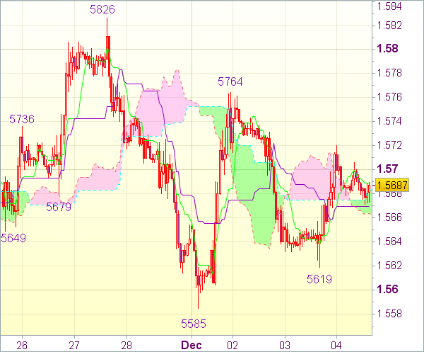 Курс валюты расположен ниже скользящих средних с периодами 55, 34, и 144, которые являются рядом уровней сопротивления 1.56925, 1.5700 и 1.5770, и в данный момент практически слился со средней с периодом 89.