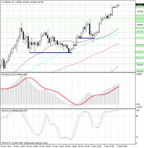 Гистограмма MACD по-прежнему расположена в положительной зоне и выше своей сигнальной линии, продолжает плавно повышаться и тем самым подает сигнал на покупку USD/JPY.