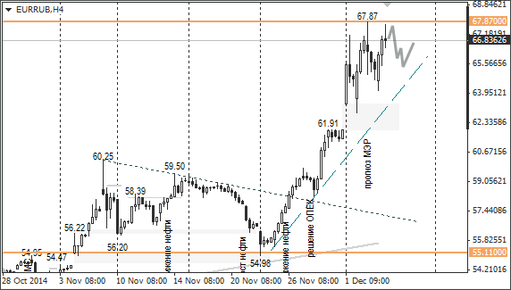 Также стоит следить за динамикой цен на чёрное золото. Если в пятницу цена на нефть марки Brent сможет удержаться выше отметки 67,75, то максимумы среды должны сдержать дальнейшее укрепление доллара и евро.
