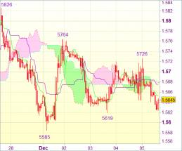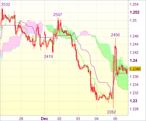Вчерашний уверенный скачок пары от 1,2282 до отметки 1,2456 указывает на образование временного минимума. Однако последовавший далее откат от 1,2456 свидетельствует о возможном начале «рваных» торгов. Также не исключено падение до 1,2350. Тем не менее нижнее Кумо (1,2328), скорее всего, остановит движение пары вниз. Далее сегодня может произойти очередной скачок вверх.