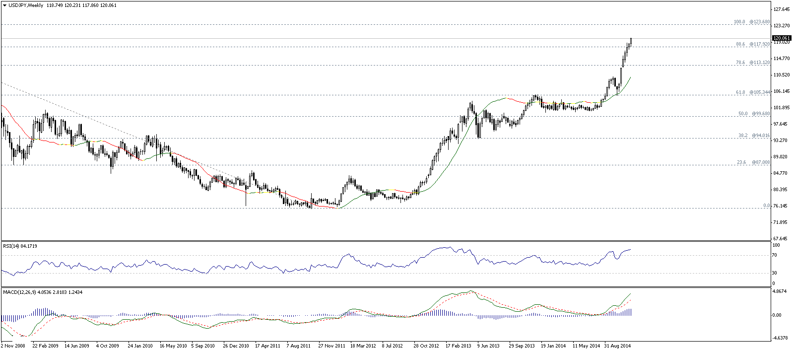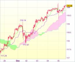 Вчера пара подскочила до нового 7-летнего максимума на 120,25, после чего доллар смог удержать высокие позиции. Это указывает на вероятность дальнейшего роста до 120,40-50 в краткосрочной перспективе. Тем не менее из-за состояния перекупленности рынка в ближайшее время резкого скачка выше 120,60 не ожидается. Зона 120,75-80 имеет все шансы устоять при первом тестировании. Затем может начаться коррекция.