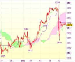 Вчерашний резкий откат пары от 0,9795 до 0,9650 является признаком формирования временного максимума. Последовавший далее рост от 0,9650 указывает на возможные «рваные» торги накануне выхода статистики в США. Также возможно движение вверх к 0,9740. Тем не менее верхнее Кумо на (0,9762), скорее всего, ограничит рост, а котировки останутся ниже сопротивления 0,9795. Затем возможен очередной откат.