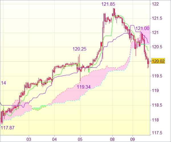 Ввиду приведенного анализа предпочтительнее продавать доллар на движении вверх до линии Киджун-сен (120,45). Затем возможно падение. Лишь прорыв сопротивления 121,00 укажет на завершение отката от 121,85 и вернет паре восходящий потенциал. Затем возможен скачок до 121,40-50.