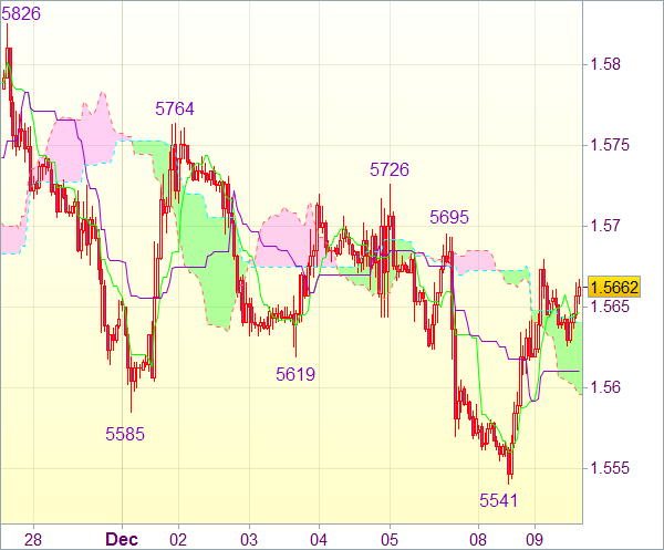 Несмотря на непродолжительный внутридневной рост до отметки 1,5695, пара не смогла пробить данное сопротивление. Текущий откат указывает на образование внутридневного максимума и возможное падение до 1,5600. Тем не менее нижнее Кумо на 1,5589, скорее всего, ограничит движение вниз. Котировки, скорее всего, останутся выше вчерашнего минимума на 1,5541. Затем возможен рост.