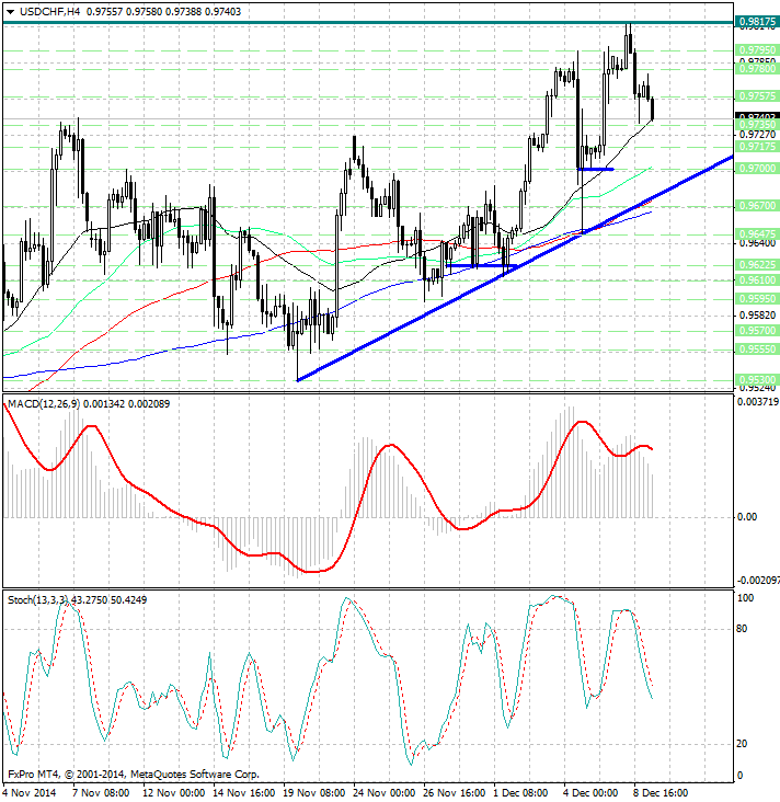 Курс валюты по-прежнему расположен существенно выше скользящих средних с периодами 55, 89 и 144, которые направлены вверх и указывают на сохраняющиеся бычьи настроения (в среднесрочной перспективе), а также являются рядом уровней поддержки 0.9700, 0.9675 и 0.9665, и в данный момент слился со средней с периодом 34.