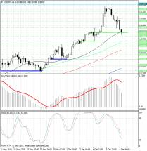 Курс валюты по-прежнему расположен существенно выше скользящих средних с периодами 55, 89 и 144, которые направлены вверх и указывают на сохраняющиеся бычьи настроения (в среднесрочной перспективе), а также являются рядом уровней поддержки 119.225, 118.70 и 117.45, и в данный момент слился со средней с периодом 34.