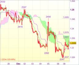 В случае движения вниз откат, вероятно, ограничится отметкой 1,2307 (линия Киджун-сен). Зона 1,2290-95 имеет все шансы устоять. Лишь уверенный пробой данных отметкой спровоцирует повторное тестирование поддержки 1,2247. Тем не менее только прорыв данного уровня продлит нисходящую волну до 1,2230-35. Однако из-за ослабления импульса резкого падения ниже 1,2190-00 не ожидается. Поэтому пока рекомендуется находиться вне рынка.
