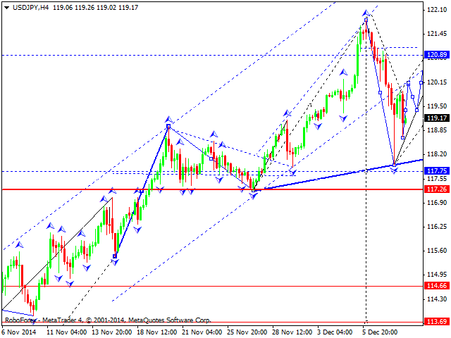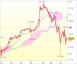 Несмотря на вчерашнее непродолжительное падение до 117,94, пара удержалась выше поддержки 117,87 и стала набирать позиции. Это отменяет наш краткосрочный негативный прогноз и указывает на дальнейшую консолидацию выше поддержки 117,87-94. Лишь пробой 120,00-10 станет признаком завершения падения от 121,85 (недельный максимум) и, вероятно, приведет к более уверенному росту до 120,35-40, а затем до 120,67 (нижнее Кумо). Тем не менее котировки вряд ли поднимутся выше сопротивления 121,00.