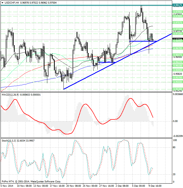Курс валюты зажат между скользящих средних с периодами 55 и 34 (уровни сопротивления 0.9710 и 0.9745) с одной стороны и средних с периодами 89 и 144 (уровни поддержки 0.96825 и 0.9670) с другой.