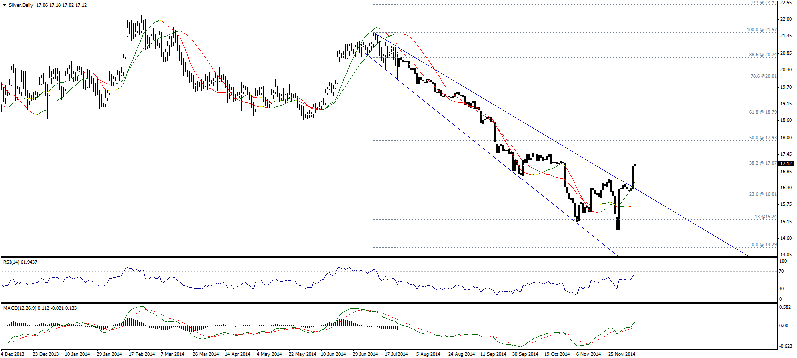 Металл пробил уровень сопротивления 16,78 и сегодня торгуется стабильно выше уровня 38,2% коррекции Фибоначчи (От волны 21,57 - 14,29). Сегодня, учитывая положительные технические индикаторы, мы ждем продолжения восходящего движения с целью 50% коррекции Фибоначчи (17,93).