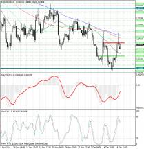 Курс валюты зажат между скользящих средних с периодами 89 и 144 (уровни сопротивления 1.2420 и 1.2435) с одной стороны и средней с периодом 34 (уровень поддержки 1.23375) с другой, и в данный момент слился со средней с периодом 55.