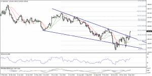 Вчера пара резко выросла коснувшись уровня сопротивления нисходящего движения, а положительные MACD, RSI и линии Линейной регрессии указывают на возможность продолжения роста. Пробой уровня 1,2435 расширит бычью волну, но имейте ввиду, что пробой области поддержки 1,2260 отменит данный сценарий.