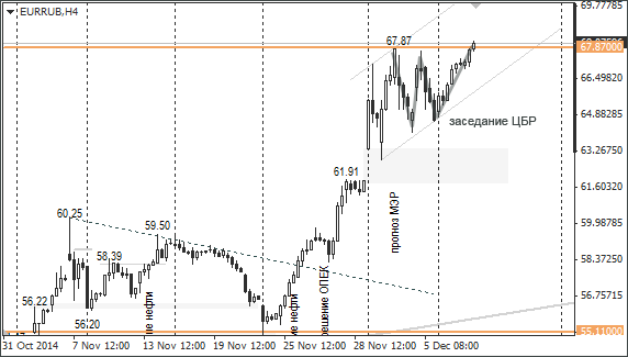 С высокой вероятностью сразу после Нового года Россию ждёт инфляционный шок. Наступление нового года традиционно используется производителями и торговыми сетями для повышения цен, к тому же повышаются различные тарифы. Есть также неофициальная информация, что российские власти просили бизнес повременить с повышением цен до наступления 2015 года. В результате, с нашей точки зрения, годовая инфляция разгонится до 11-12%, на этот же уровень должны быстро выйти и ставки ЦБ.
