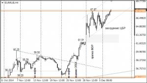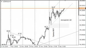 Обратите внимание на ниже приведённые графики. Сформировались W-образные модели. Аналогичное поведение рынка наблюдалось с 7 ноября. Если бы не сегодняшнее решение ЦБ, то я бы рассматривал падение к 52,60 по доллару и 65,20 по евро. Из-за ЦБ ситуация 50 на 50. При уверенном прорыве курсов доллара через 55 и евро через 68 стоит ожидать их дальнейшего роста на 2,5 рубля и 3 рубля соответственно. Решение ЦБ определит судьбу рубля на ближайшее время.