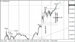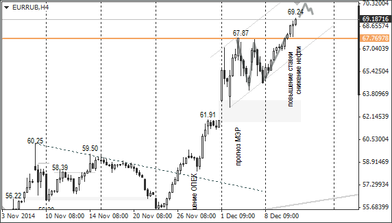 Ключевая поддержка по нефти находится в зоне 56-60 долларов за баррель. Если снижение цен на нефть остановится около 60 долларов за баррель, то падение рубля замедлится на этих уровнях: по отношению к доллару на уровне 57-58 рублей, к евро в зоне 71-72 рублей. Если нефть подешевеет до 56 долларов, то можно к последним значениям прибавить ещё по 3 рубля.