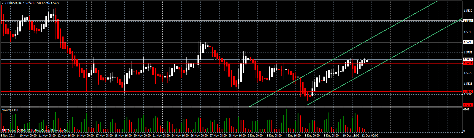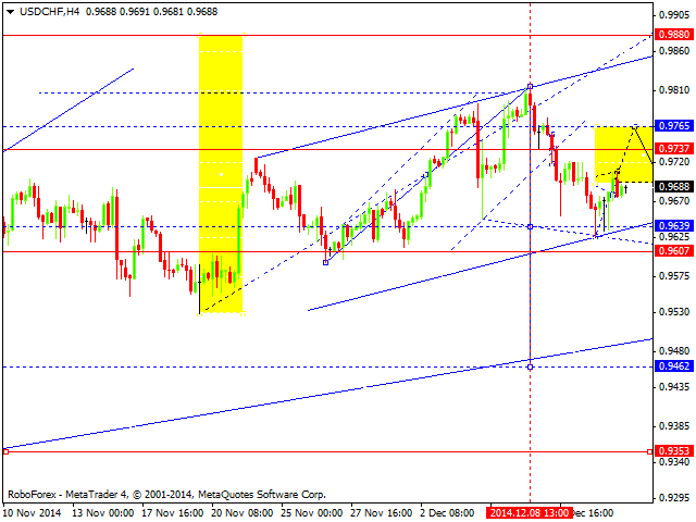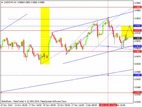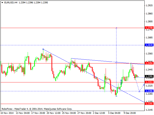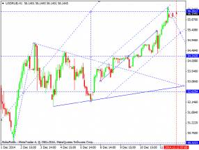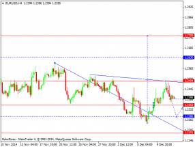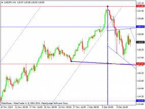 Продавать сейчас можно лишь после того, как пара опуститься и закрепиться под 1.5711, как собственно это было вчера. Дополнительные продавцы в рынке появятся теперь лишь после реального пробоя и закрепления под нижней границей восходящего канала зеленого цвета R2. Пока, до этого времени, относиться к шортам нужно с большой осторожностью. Если пробой состоится, вероятней всего фунт нацелится на 1.5592, но это уже на следующей неделе. Стоп приказы по таким сделкам лучше всего выставлять, либо выше максимума сегодняшнего дня, либо выше максимума 11 декабря.