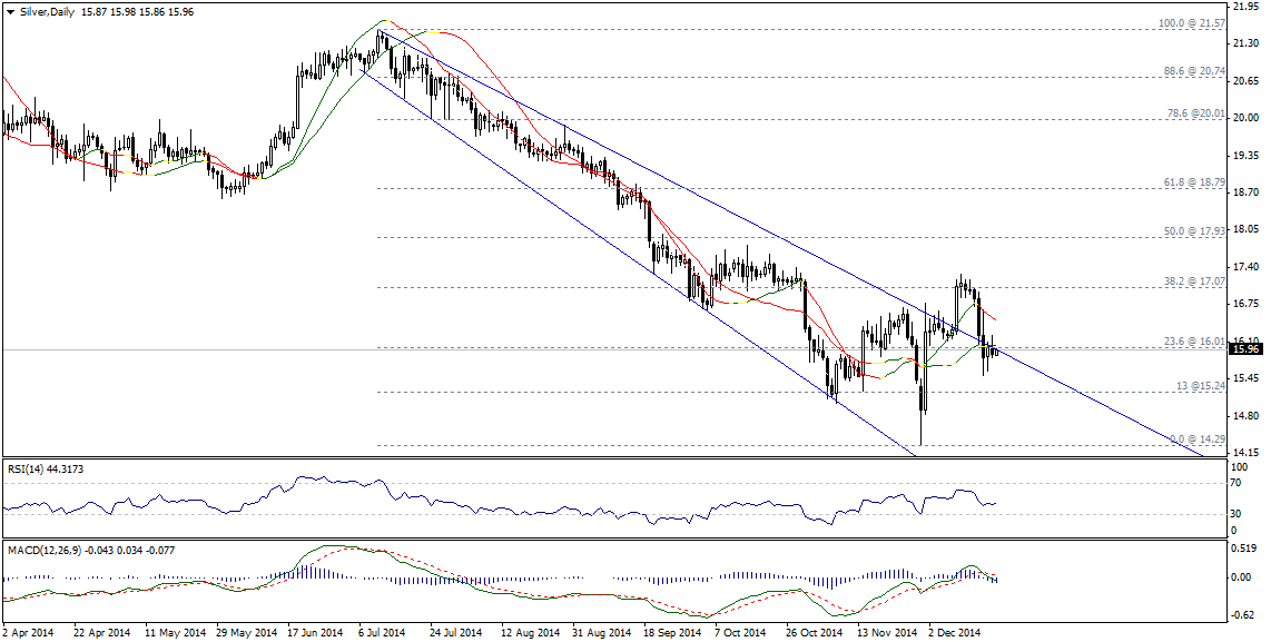 Вчера Серебру не удалось закрепиться выше уровня 16,00 и сегодня торги идут ниже линий Линейной регрессии, а так же ниже уровня сопротивления нисходящего канала. Тем не менее, учитывая нейтральные технические индикаторы и торговлю выше уровня 15,65, мы не можем прогнозировать дальнейшее снижение металла и предпочитаем оставаться вне рынка.