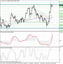 Гистограмма MACD по-прежнему расположена в положительной зоне и выше своей сигнальной линии, продолжает плавно повышаться и тем самым подает сигнал на покупку USD/CHF.