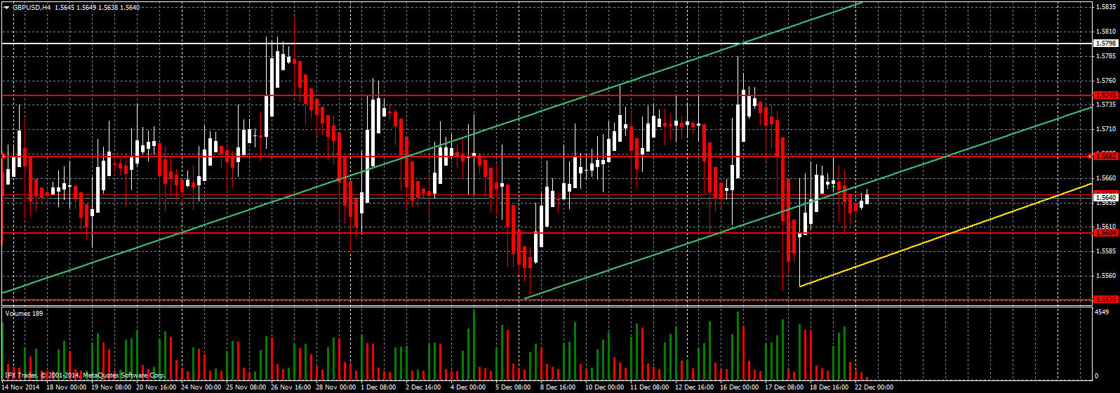 Шортить рынок можно сейчас, либо после теста нижней границы нисходящего канала зеленого цвета R2, а также сильного сопротивления 1.5682. Тест этих уровней должен сопровождаться с появлением хорошего объема в рынке. Если его заметно не будет, я советую отказаться от коротких позиций. Основной целью шорта будет область 1.5604, а также желтая линия стандартного отклонения нижней границы нисходящего канала R2. Стоп приказы по таким сделкам я рекомендую расставлять выше 1.5682 на 7-10 пунктов.