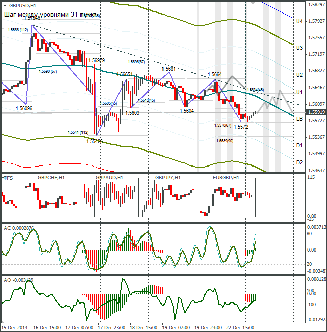 Техническая картина противоречивая между парами EUR/USD и GBP/USD. По фунту четырёхчасовые индикаторы указывают на его восстановление, по евро – снижение. Так как часовые индикаторы развернулись вверх, от фунта буду ждать коррекцию к трендовой линии. Закрытие дня у меня получается в районе линии lb. В случае стремительного роста кросса EUR/GBP, паре фунт/доллар придётся консолидироваться в области 1,56.