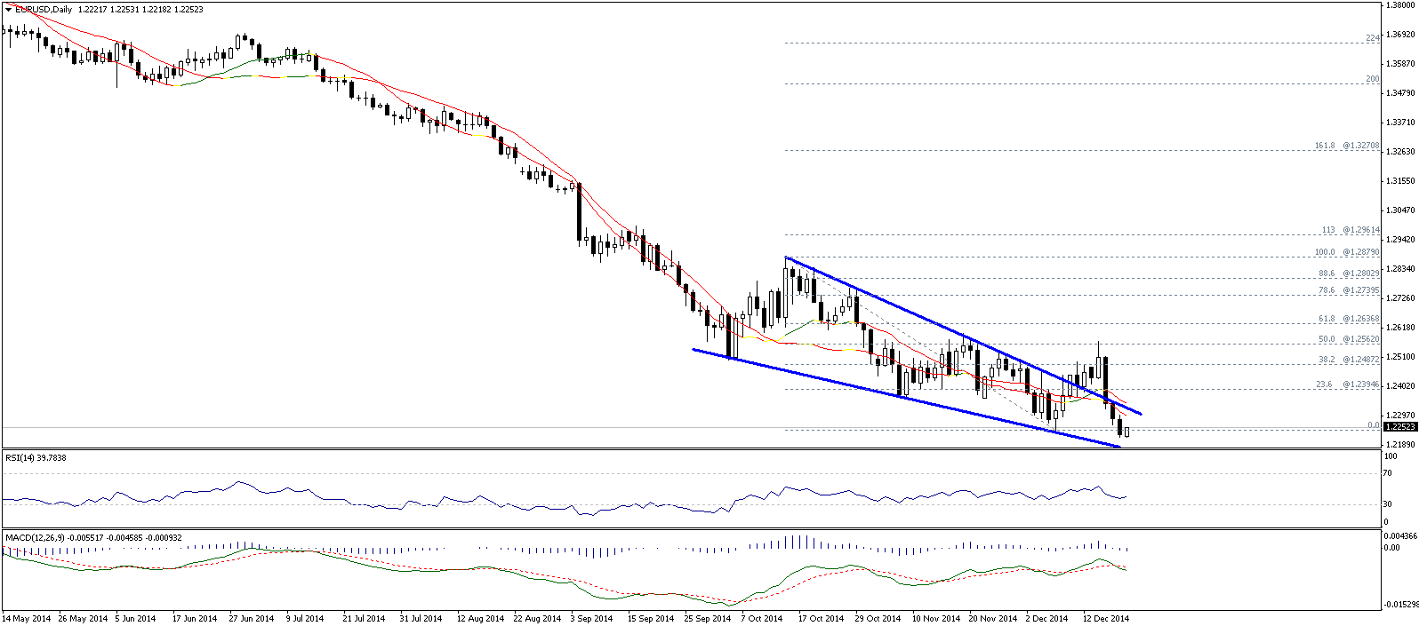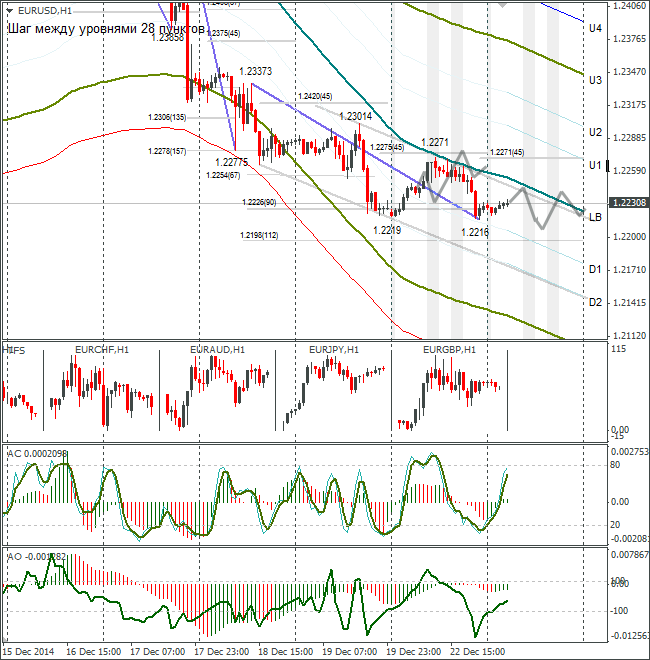 Предновогодняя суматоха уже охватила финансовый мир, а текущая неделя уже будет урезана в плане торгов в связи с близящимся празднованием католического Рождества. Обычно рынки в этот период очень спокойны, так как большинство участников закрывают свои позиции, выключает компьютеры и посвящают себя своим семьям. Тем не менее, в наше нестабильное время условия сниженной ликвидности могут создать опасную среду: любое геополитическое событие может вызвать преувеличенную реакцию финансовых инструментов. Конечно, шансы на такой исход не так уж велики: все что можно было, включая обвал нефти, распродажи рубля и неожиданные решения от ЦБ России и Швейцарии, уже произошли и заложены в цену. Сегодня Штаты опубликуют окончательные данные по ВВП за 3 квартал, а также отчет по заказам на товары длительного пользования, от которых ждут превышения прогнозов. Очередные свидетельства стабильных темпов восстановления американской экономики могут поддержать новую волну спроса на USD, которая в рамках сниженной ликвидности может вызвать резкие скачки валютных пар. Не исключено, что EUR/USD попытается пробить поддержку 1,22 и направиться в район 1,2140, невиданный с августа 2012 года.