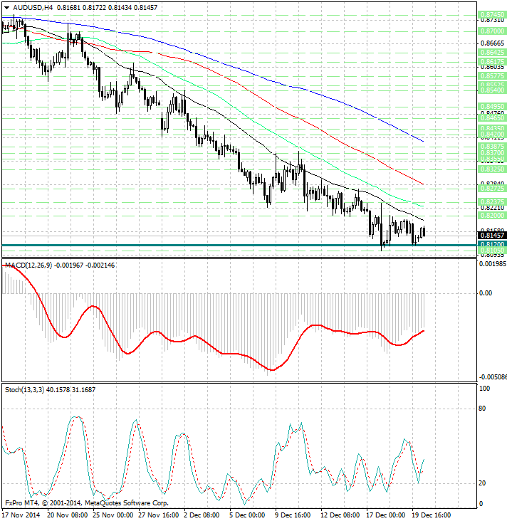 Курс валюты расположен существенно ниже скользящих средних с периодами 34, 55, 89 и 144, которые направлены вниз и указывают на сохраняющиеся медвежьи настроения (в среднесрочной перспективе), а также являются рядом уровней сопротивления 0.81875, 0.8225, 0.8285 и 0.8400.