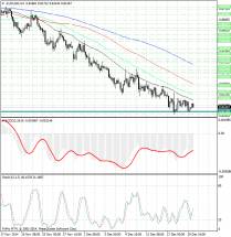 Гистограмма MACD расположена в отрицательной зоне, но выше своей сигнальной линии, продолжает плавно повышаться и тем самым подает сигнал на покупку австралийского доллара (AUD).