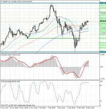 Гистограмма MACD расположена в положительной зоне и выше своей сигнальной линии, но начала двигаться практически параллельно оси времени и в данный момент не подает четких сигналов.