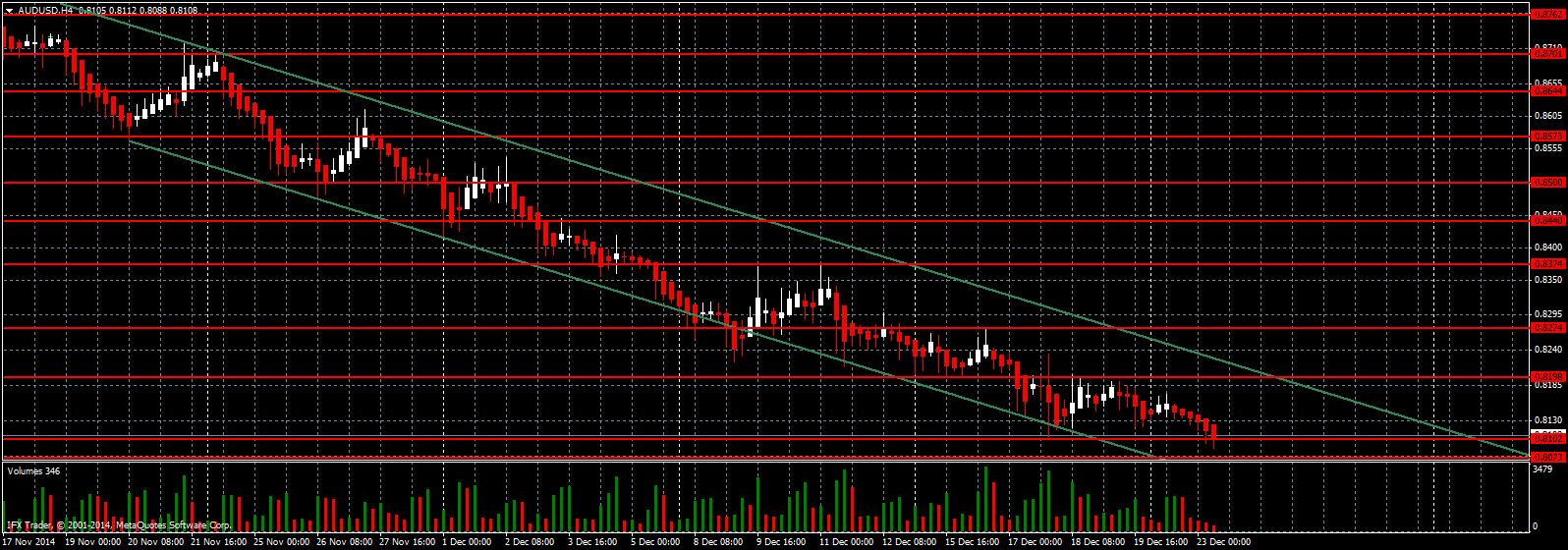 Шортить сейчас по паре я не рекомендую, так как можно серьезно попасть в коррекцию, после очередного обновления годовых минимумов. Лучше всего открывать короткие позиции после восстановления в район 0.8198, либо от верхней границы нисходящего канала зеленого цвета R2. Стоп приказы необходимо выставлять выше этих уровней. Основной целью шортов в таком случае, будут уровни 0.8073, и также нижняя граница нисходящего канала зеленого цвета R2. Падение котировок нефти к годовым минимумам будет дополнительным хорошим сигналов к продажам австралийского доллара.
