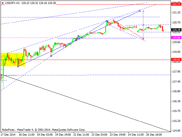 Здесь мы следим за развитием восходящей структуры от 16 декабря. Продолжения движения кверху ожидаем после пробоя 121.06, здесь цель – 121.55, в этом коридоре консолидация цены. Проход ценой уровня 121.60 должен сопровождаться развитием выраженного движения, здесь цель – 122.66. Потенциальным значением для верха считаем уровень 123.19, по достижении которого ожидаем консолидацию. Краткосрочное нисходящее движение возможно в коридоре 120.24 – 119.79, пробой последнего значения приведет к развитию углубленной коррекции, здесь цель – 119.00. Основная тенденция – развитие восходящей структуры от 16 декабря.