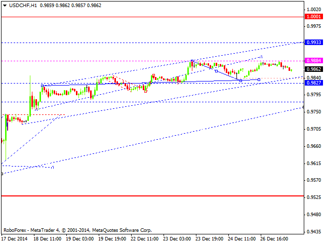 Здесь мы продолжаем следить за восходящей структурой от 16 декабря. Здесь продолжения движения кверху ожидаем после пробоя 0.9891, в данном случае цель – 0.9922, возле этого уровня консолидация цены. Потенциальным значением для восходящего движения считаем уровень 0.9985, по достижении которого ожидаем откат книзу. Краткосрочное нисходящее движение возможно в коридоре 0.9846 – 0.9824, пробой последнего значения приведет к развитию углубленной коррекции, здесь цель – 0.9780. Основная тенденция – развитие восходящего движения от 16 декабря.
