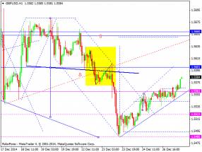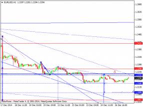 Здесь мы продолжаем следить за развитием нисходящего цикла от 16 декабря. Краткосрочное нисходящее движение ожидаем в коридоре 1.2130 – 1.2088, пробой последнего значения позволит рассчитывать на движение к потенциальной цели – 1.2015, по достижении которого ожидаем откат кверху. Краткосрочное восходящее движение возможно в коридоре 1.2225 – 1.2263, пробой последнего значения будет располагать к формированию потенциала для верха, здесь цель – 1.2320. Основная тенденция – развитие нисходящей структуры от 16 декабря.